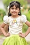 Featuring a pearl white top for girls in taffeta base with puff sleeves and bird print. It is paired with a lime green skirt. Accessorise it with matching hair accessories and sandals for a stylish ensemble, ideal for a festive occasion or mehendi ceremony.