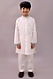 Featuring a white and blue nehru jacket for boys in cotton base with geometric print. It is paired with a white kurta and pyjama pants. Style it with a watch and a classic pair of shoes for a any event, wedding or festive ceremonies