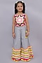 Featuring a multi-colored top for girls in cotton base with geometric print. It is paired with printed sharara pants. Style it with jewellery and juttis for a festive occasion, wedding or engagement ceremony.