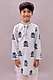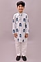 Featuring a white kurta for boys in cotton base with floral print and mirror work. It is paired with pyjama pants. Style it with juttis and a watch for a festive occasion.