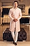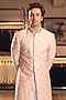 Featuring an apricot sherwani in raw silk base with embroidery. It is paired with a contrasting kurta and pants.