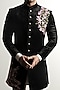 Featuring a black indo-western jacket in velvet base with floral embroidery. It is paired with a contrasting kurta and pants.