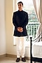 Featuring a black indowestern jacket in velvet base with glass cutwork. It is paired with a kurta and off-white cotton silk pants. Style it with mojaris for a wedding, sangeet or engagement ceremony, radiating charm and elegance.