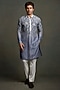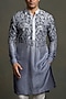 Featuring an ombre grey kurta in dola silk base with thread embroidery. It is paired with cotton silk white pants. Style it with classic mojris or loafers and a statement watch for a refined traditional look, Ideal for festive gatherings, wedding functions, or family celebrations.