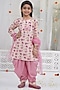 Featuring a peach kurta for girls in cotton base with embroidery. It is paired with embroidered crepe dhoti pants and a dupatta. Style it with sandals and hair accessories for festive occasions.