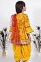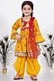 Featuring a yellow kurta frock in cotton mix base with Jaipuri lace and patch work embroidery. It is paired with matching salwar pants and a contrasting dupatta.