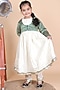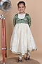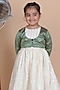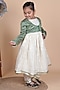 Featuring a green jacket for girls in lurex cotton base with lace work. It is paired with an off-white anarkali, pants and a dupatta. Style it with cute hair accessories and sandals for a birthday party celebration.