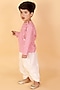 Featuring a pink kurta in cotton base with print and shell buttons on the placket. It is paired with contrasting dhoti pants.