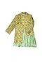 Featuring a yellow asymmetrical jacket in brocade base. It is paired with a contrasting green kurta having tucks including pants.
