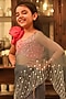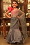 Featuring a grey saree in silk organza, german satin, and mulmul base with embroidery. It is paired with a contrasting blouse.