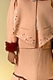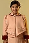 Featuring a peach skirt in cotton slub and organic sherpa base with fur detailing. It is paired with a matching blazer having puffed sleeves.