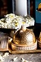 This hammered gold tray set with mother of pearl handles makes it a beautiful work of art. This set contains a tray, and three jars finished with a touch of aluminium and mango wood detail on the lids. Ideal to be used to serve a variety of nuts, sweets and mouth fresheners.