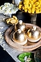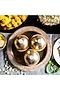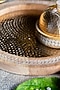 This hammered gold tray set with mother of pearl handles makes it a beautiful work of art. This set contains a tray, and three jars finished with a touch of aluminium and mango wood detail on the lids. Ideal to be used to serve a variety of nuts, sweets and mouth fresheners.
