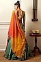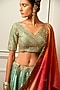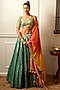 Featuring a teal green lehenga in dupion silk and chanderi silk base with embroidery. It is paired with a matching hand embroidered blouse and a tussar silk shaded dupatta.