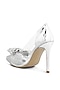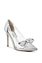 Featuring a pair of silver pumps heels in PVC base with rhinestone and bow embellishments. It has a resin sole, a cushioned insole and 3.9-inch stiletto heels.