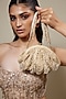 Featuring a beige pouch bag in satin base with fringes, microbeads and pearls hand embroidery. It has a soft suedette lining, an embellished top handle and a long detachable chain. Elevate your stride with timeless elegance and exceptional craftsmanship, perfect for festive occasions or wedding ceremonies.