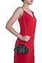 Featuring a black pouch clutch in satin and faux suede base with fine japanese bugle beads embroidery. It has a suedette lining and long chain handle.
