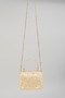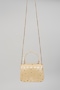 Featuring a champagne mini bag in satin base with micro beads and crystal hand embroidery. It has a soft suede lining, embellished top handle and a crossbody chain. Carry it as a statement piece with traditional attire for weddings, events, or festive celebrations.
