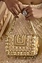 Featuring a gold flapover clutch in veivet base with japanese microbeads, semi precious stones, nuggets, and crystals hand embroidery, including handmade tassels. It has an embellished handle and a suede lining.