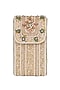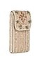 Featuring a pastel multi-colored mobile pouch in satin base with japanese beads, semi-precious quartz, stones, and kundan. It has a crossbody chain, adjustable belt, and a suedette lining.
