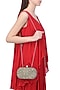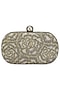 Featuring a silver oval box clutch in suede base with rose motifs and an ombre effect all over delicately hand embroidered using japanese seed beads. It has suedette lining, a long chain handle and a round metal clasp.