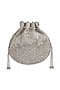 Featuring a silver potli in satin base with rhinestone and japanese micro beads hand embroidery. It has a soft suede lining. This versatile accessory is perfect for both casual and sophisticated occasions.