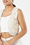 Featuring white flared pants in cotton crush base. It is paired with a matching blouse and a crochet net shrug having 3D crystal rainbow sequins, pearls, and beaded embroidery.