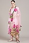 Featuring a blush pink kurta in mul satin base with hand paint. It is paired with matching swiss cotton pants and a silk organza dupatta.