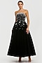 Featuring a black A-line strapless midi dress in velvet base with embellishments. Style it with statement dangler earrings, a sleek clutch, and heels, perfect for galas, cocktail or evening parties.