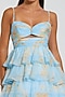 Featuring a blue ruffled tiered gown in chiffon base with floral print, cut-out detail and a sweetheart neckline. Accentuate it with statement earrings and block heels for cocktail parties or evening soirees.