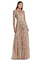 Featuring a mocha gold gown in mesh base with an illusion neckline, sheer sleeves, hand beads and sequins embellishments. Style it with statement dangler earrings, a sleek clutch, and heels, perfect for galas, weddings, or the red carpet.