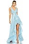 Featuring a powder blue gown in sheer organza base with cut-out detail, ruffled hemline and v-neck. Accentuate it with statement earrings and heels for an evening or cocktail look.