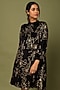 Featuring a black dress in modal and cupro base with gold print and antique gold zari embroidery. It is paired with a belt.
