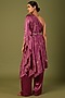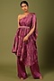 Featuring a purple tunic in cupro modal base with gold print and zari embroidery. It is paired with matching pants and a belt.