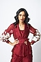 Featuring a red wrap-style blazer top in chanderi silk base with sheer sleeves and a cinched waist. It is paired with wide-legged pants. Accentuate it with statement earrings and heels for evening wear, date nights or cocktail soirees.