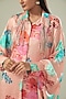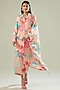 Featuring a powder pink high-low kaftan in modal satin base with print and tasselled collar detailing. It is paired with matching pants.