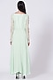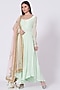 Featuring a honey dew coloured anarkali in silk dupion and silk georgette base with zardosi embroidered floral motifs. It is paired with matching satin churidar pants and a lotus pink net dupatta having tassels.