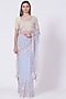 Featuring a pale blue saree in silk organza base with sequins motif hand embroidery, shell trinkets, and organza floral tassels. It is paired with a contrasting blouse.
