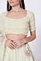 Featuring a pista green pleated lehenga in silk organza base with floral pearl print and floral sequins embroidery, including a cutwork border. It is paired with a matching hand-embellished blouse and a dupatta having floral tassels.