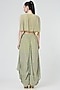 Featuring a spring green crop top in crepe and chiffon base with floral print and beads latkan hand work. It is paired with matching printed dhoti pants.