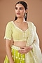 Featuring a green lehenga in silk chanderi base with zardosi, sequins, pearls and gota hand embroidery, including silk organza inserts. It is paired with a matching pure georgette hand-embroidered blouse and a silk organza dupatta having handmade tassel detailing. Perfect wear for an engagement or a wedding ceremony.