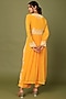 Featuring a tangerine gathered kurta in chiffon base with applique, pearls, and tikki detailings. It is paired with matching palazzo pants and an organza dupatta.