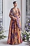 Mahima Mahajan presents an amber yellow anarkali in silk organza base with embroidery and print. It is paired with an embroidered dupatta. Own the spotlight in block heels and dangler earrings that amplify your look, perfect for haldi ceremonies.