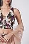 Featuring a blush pink lehenga in modal satin, organza, and shantoon base. It is paired with a contrasting printed blouse and a dupatta.