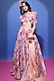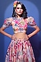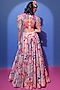 Featuring a nude lehenga in organza, net, and shantoon base with tropical print. It is paired with a matching embroidered blouse and a dupatta.