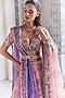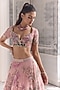 Mahima Mahajan presents a blush pink lehenga in silk organza base with embroidery and print. It is paired with a blouse, an embroidered belt and two dupattas. Make an entrance in crystal heels that amplify your lehenga and your presence, perfect for wedding or sangeet ceremonies.
