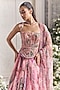 Mahima Mahajan presents a blush pink lehenga in silk organza base with floral print. It is paired with an embroidered corset having detachable straps and a dupatta. Turn heads in block heels and polki earrings that magnify your lehenga set, perfect for weddings or sangeet ceremonies.