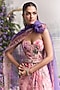 Mahima Mahajan presents a blush pink draped skirt in silk organza base with print. It is paired with a panelled corset, a dupatta and a belt. Own the spotlight in block heels and dangler earrings that amplify your look, perfect for cocktail soirees or sangeet ceremonies.