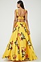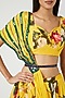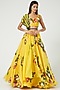 Featuring a bright yellow lehenga in organza base with zardosi embroidery and floral print. It is paired with a matching blouse, a dupatta, and a hand embroidered belt.