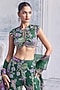 Mahima Mahajan presents a forest green blouse in silk organza base with hand embroidery and print. It is paired with sharara pants and an embroidered dupatta. Own the spotlight in block heels and polki earrings that amplify your look, perfect for weddings or festive ceremonies.